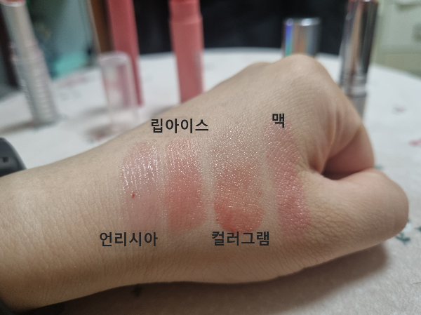 3. 장점 : 언리시아(반짝반짝), 립아이스(촉촉,자연스럽), 컬러그램(없음), 맥(케이스예쁨)